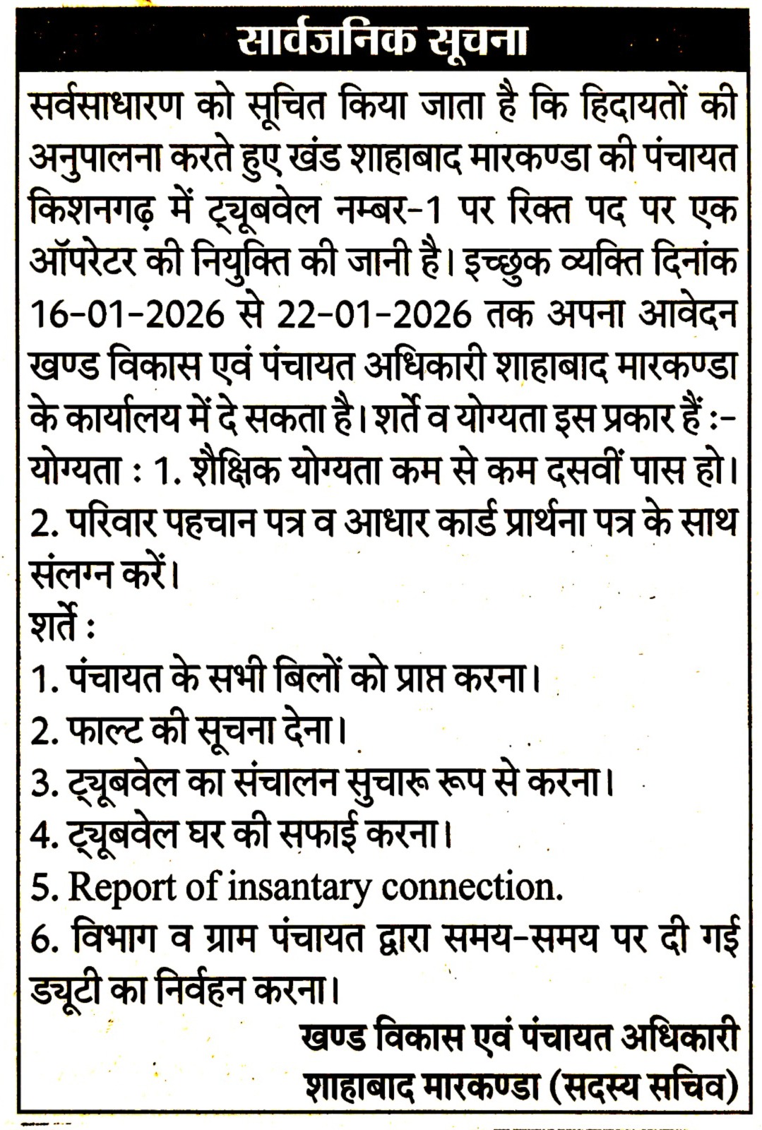 All eligible and interested candidates can apply offline for Haryana Tubewell Operator Recruitment 2026 starting from 16 January 2026. The last date to submit the offline application form is 22 January 2026 (Village-wise).