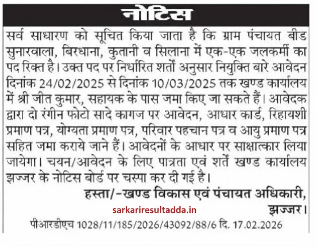 Haryana Tubewell Operator Vacancy 2026: The Block Development and Panchayat Department, Kurukshetra (District Kurukshetra) has released the latest notification for the recruitment of Tubewell Operator (जलकर्मी) posts on a contract basis for various villages of Kurukshetra District.