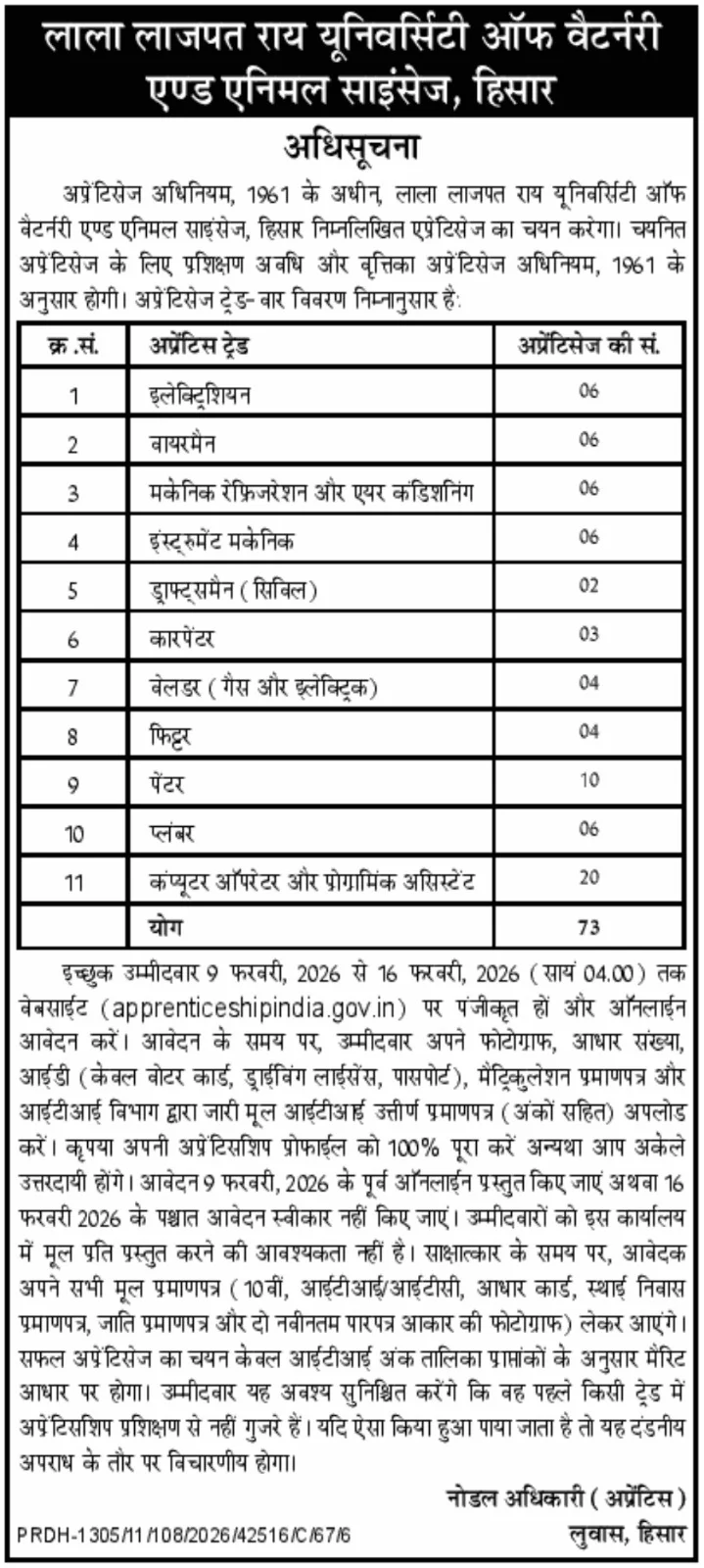 LUVAS University Hisar Apprentice 2026 : The Lala Lajpat Rai University of Veterinary and Animal Sciences (LLRUVAS), Hisar has released the latest official notification for the recruitment of Various ITI Apprentice posts. This recruitment is open for all eligible Indian candidates who are interested in government jobs. Candidates who fulfill the required eligibility criteria can apply through Online mode as mentioned in the official notification. The application process will start from 09 February 2026 and the last date to apply is 16 February 2026.