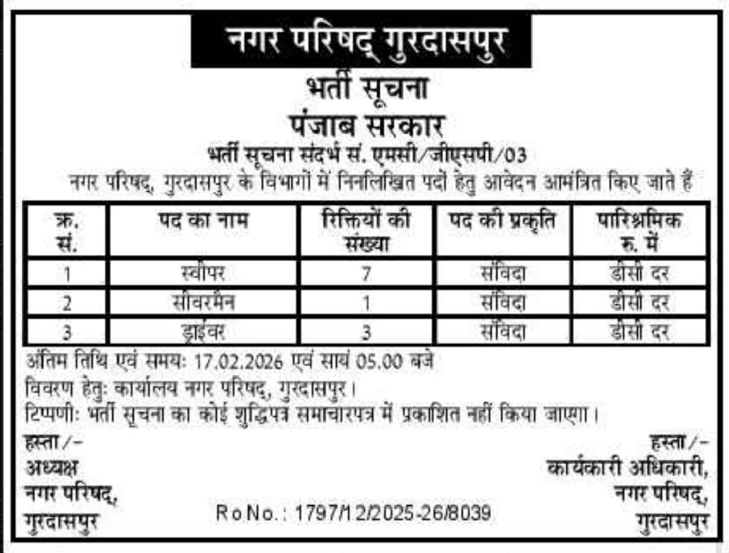 Municipal Council Gurdaspur Recruitment 2026 : The The Municipal Council Gurdaspur Recruitment has released the latest official notification for the recruitment of Sweeper, Sewer Man and Driver Posts. This recruitment is open for all eligible Indian candidates who are interested in government jobs. Candidates who fulfill the required eligibility criteria can apply through Offline mode as mentioned in the official notification. The application process will start from not declared and the last date to apply is not declared.