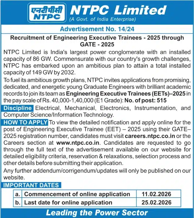 NTPC Engineering Executive Trainees Recruitment 2026 : The NTPC Limited has released the latest official notification for the recruitment of Engineering Executive Trainee (EET). This recruitment is open for all eligible Indian candidates who are interested in government jobs. Candidates who fulfill the required eligibility criteria can apply through Online mode as mentioned in the official notification. The application process will start from 11 February 2026 and the last date to apply is 25 February 2026.