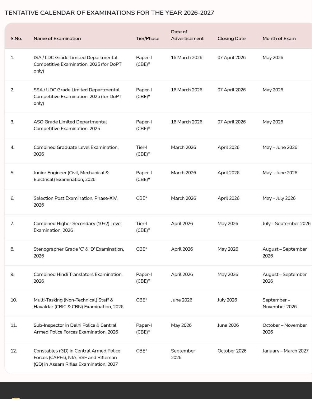 SSC Exam Calendar 2026-27: The Staff Selection Commission (SSC) has released the tentative examination calendar for the year 2026–27, covering major recruitment exams such as CGL, CHSL, JE, MTS, CPO, GD Constable, Stenographer, and departmental examinations. According to the calendar, most notifications will be released between March and September 2026, while examinations are scheduled from May 2026 to March 2027. All major exams will be conducted in Computer Based Examination (CBE) mode. Candidates preparing for SSC exams should carefully note the advertisement dates, application closing dates, and exam months to plan their preparation effectively.