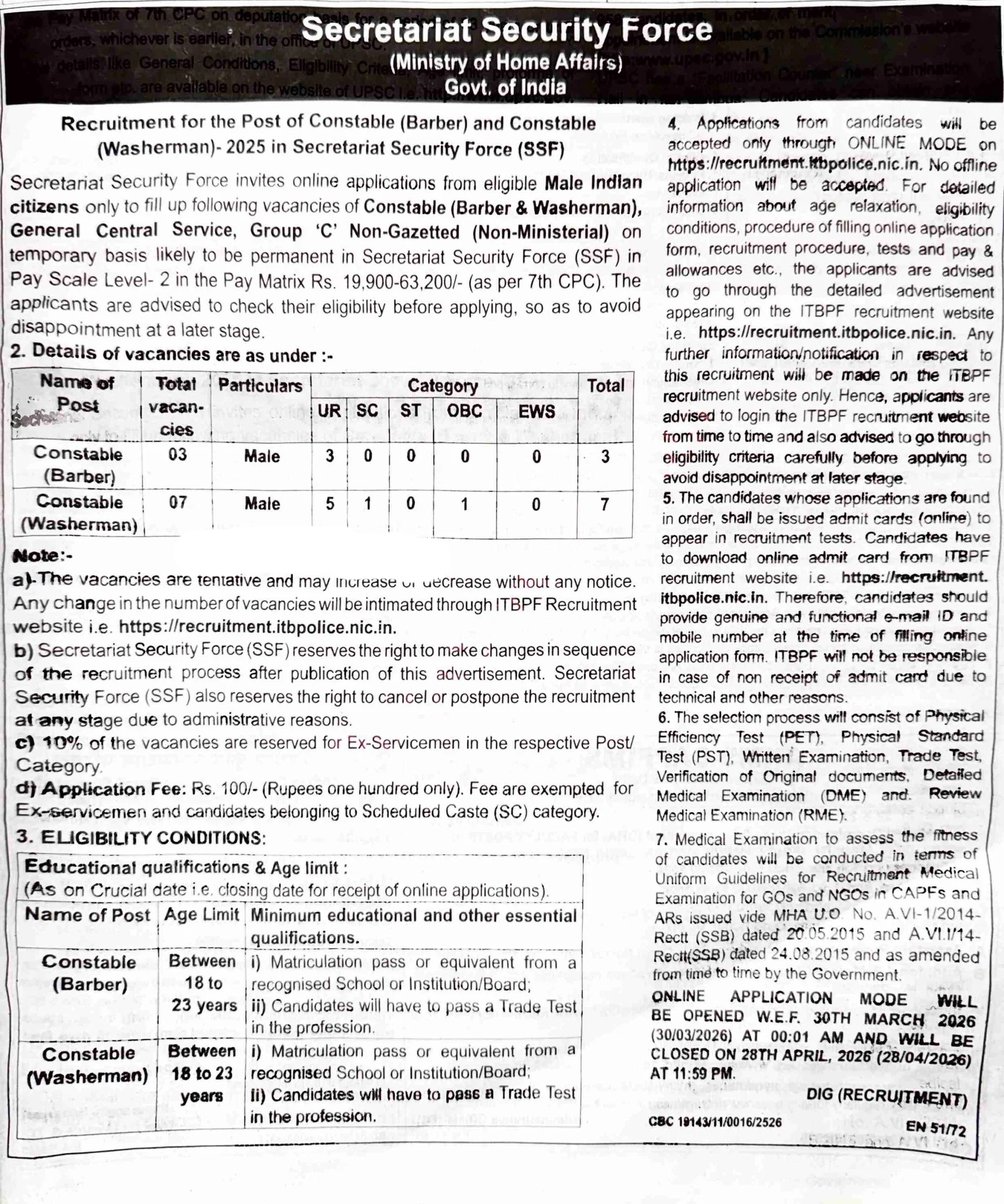 SSF Tradesman Recruitment 2026 : The Secretariat Security Force (SSF) has released the latest official notification for the recruitment of Constable (Barber & Washerman) posts. This recruitment is open for all eligible Indian candidates who are interested in government jobs. Candidates who fulfill the required eligibility criteria can apply through Online mode as mentioned in the official notification. The application process will start from 19 March 2026 and the last date to apply is 28 April 2026.
